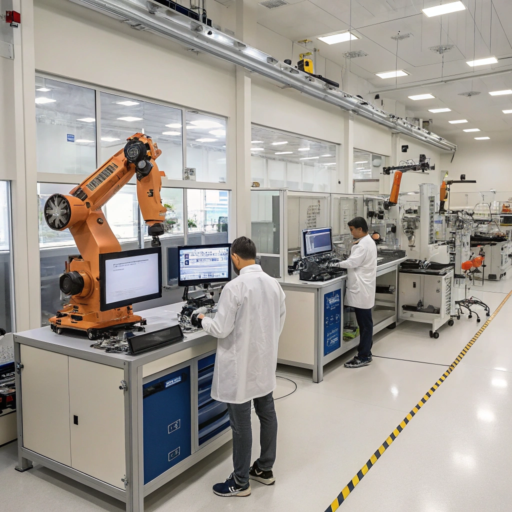 An innovative robotics lab filled with cutting-edge machines and technology.