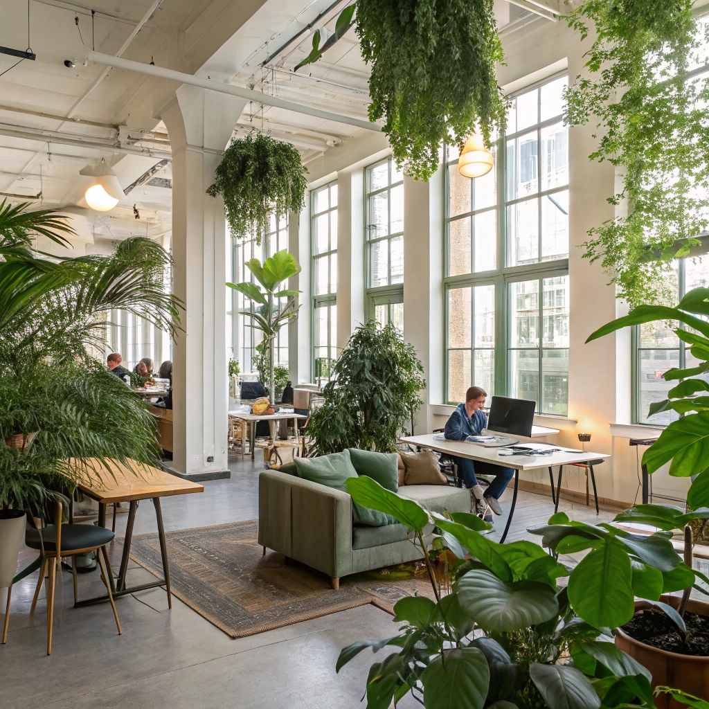 An inspiring co-working space filled with green plants and collaborative working areas.