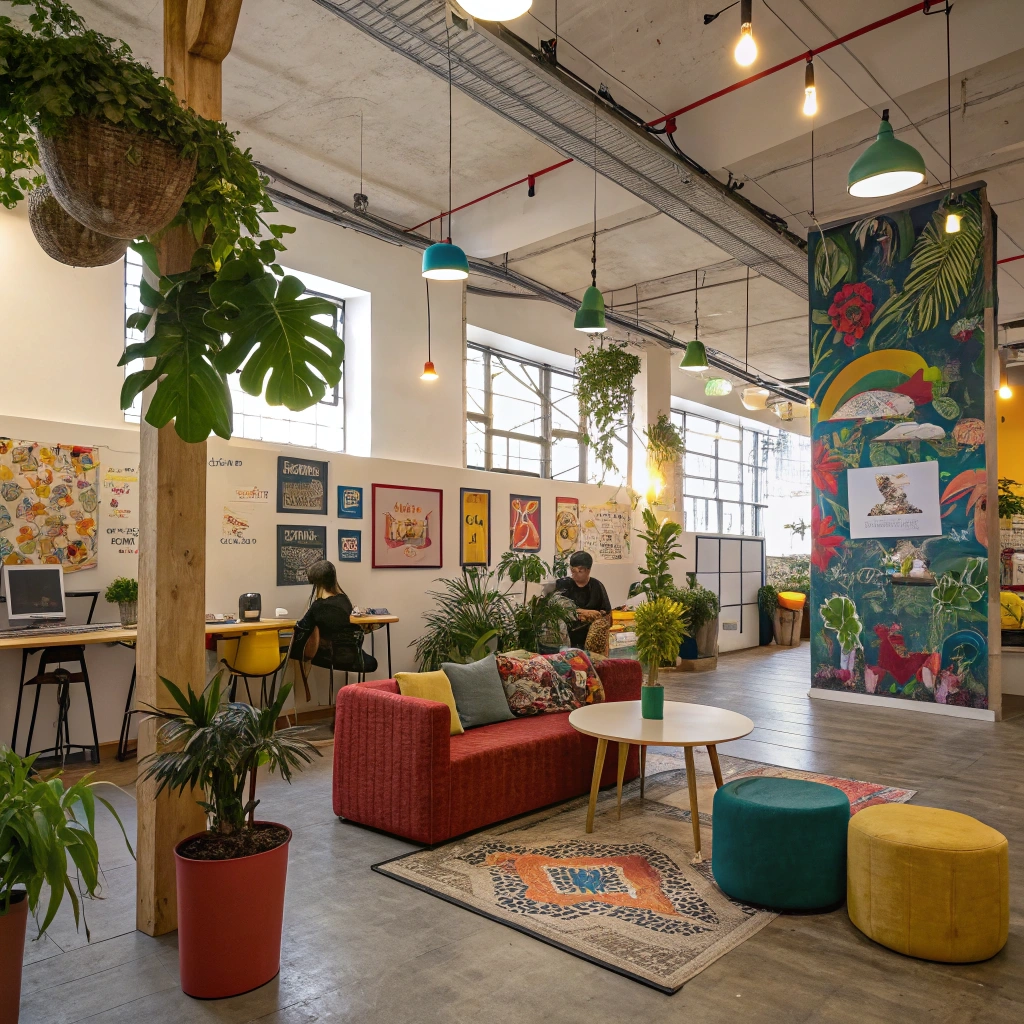An inspiring co-working space where creativity flows, featuring collaborative areas and art.