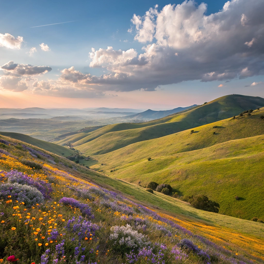 An inspiring landscape of rolling hills covered in vibrant wildflowers
