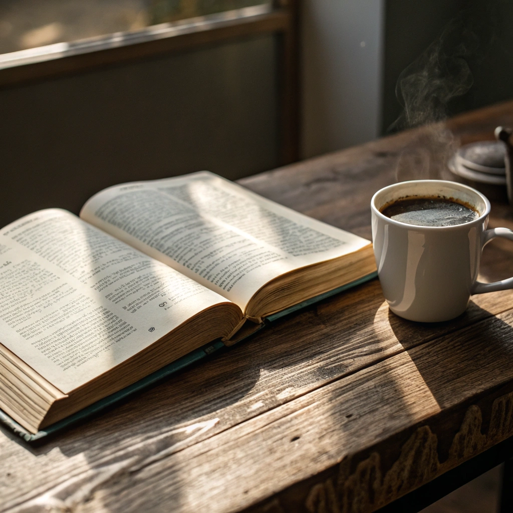 An open book resting on a table next to a steaming cup of coffee, creating a warm atmosphere for reading.