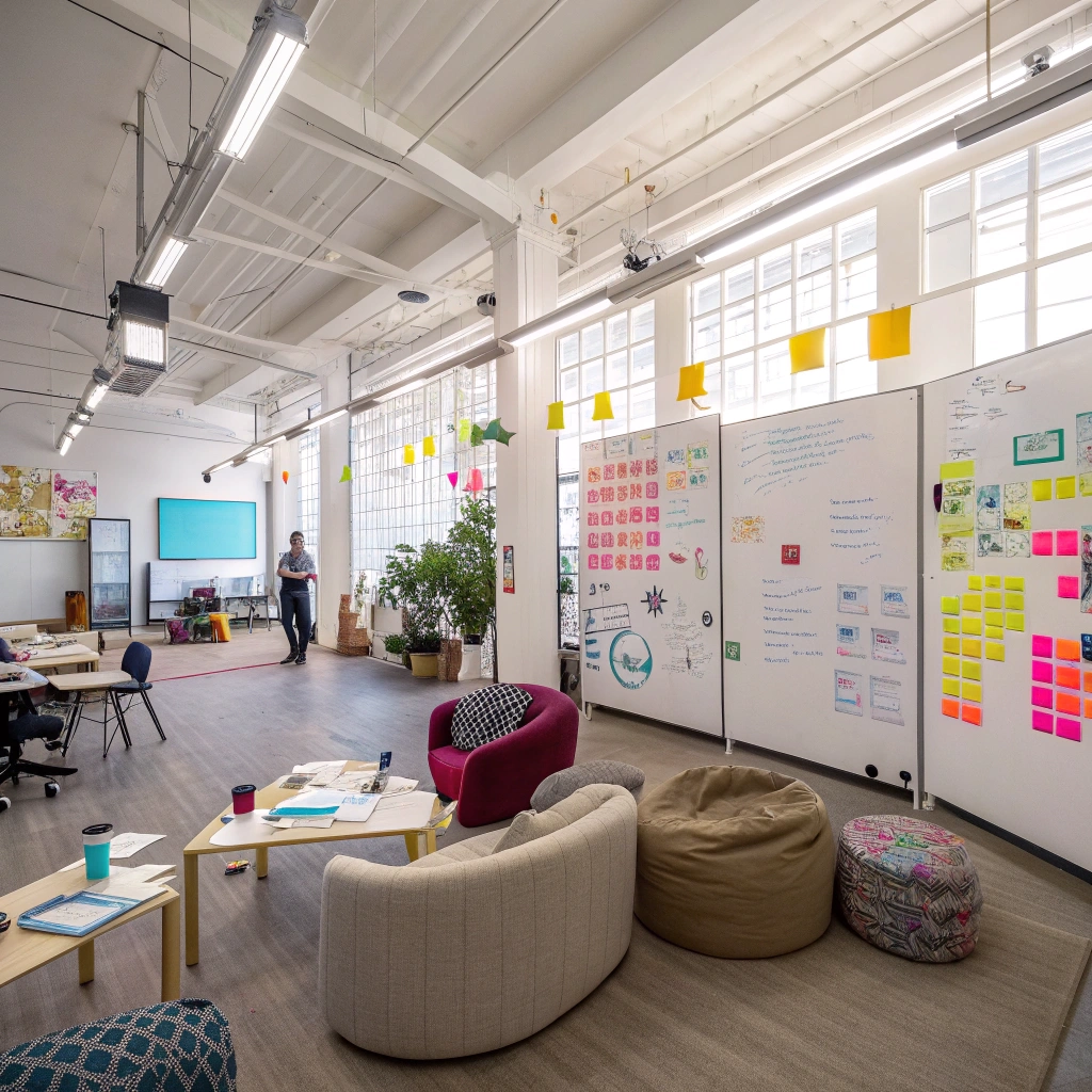 An open workspace filled with brainstorming tools, encouraging collaboration and innovative thinking