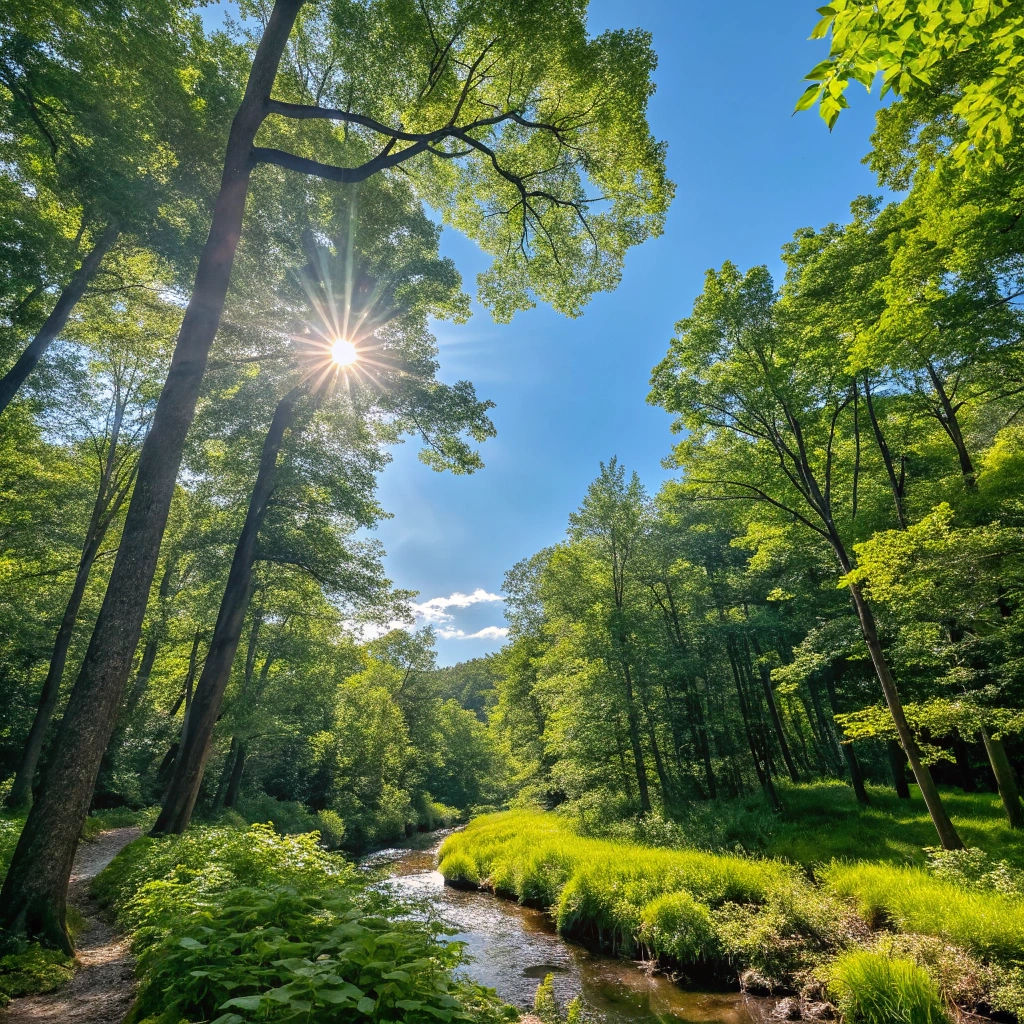 Lush green forest under a bright blue sky, with sunlight filtering through the leaves.