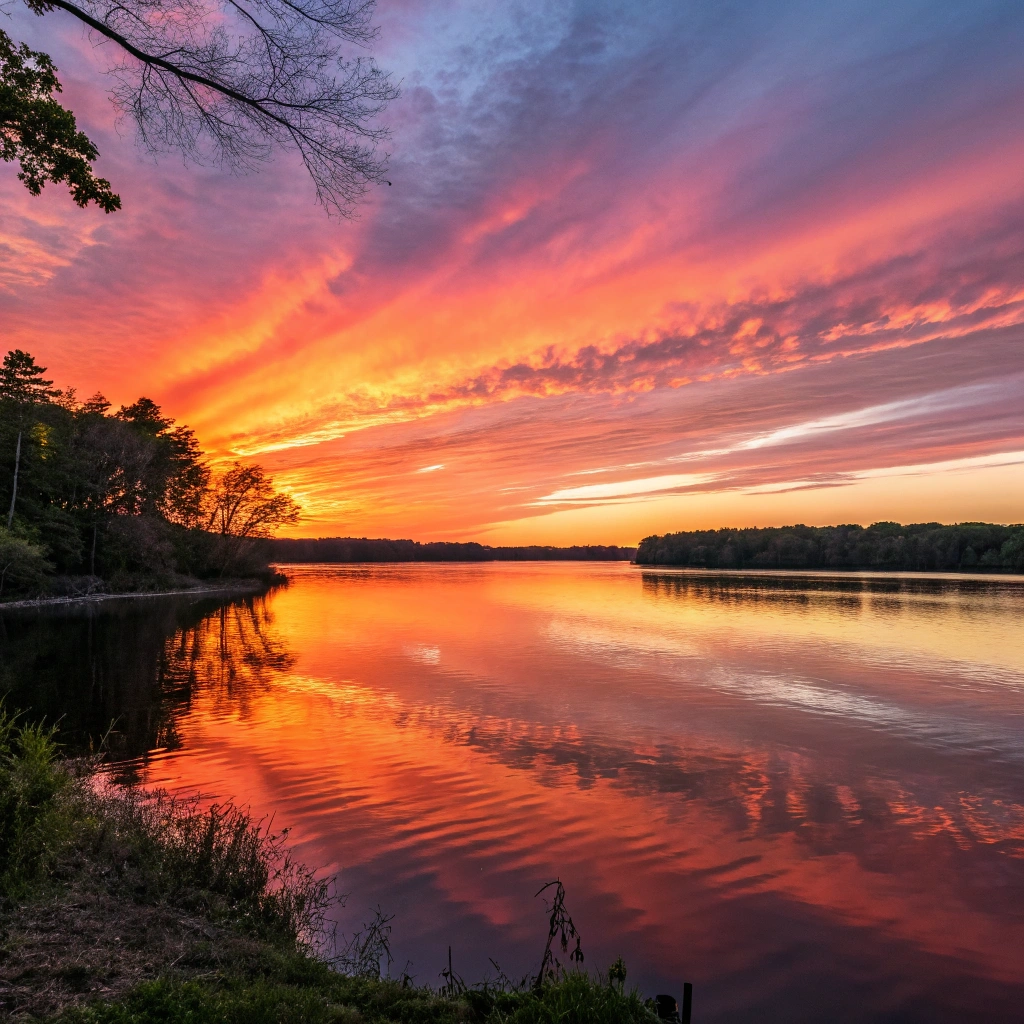 - A captivating sunset over a tranquil lake, with vibrant colors reflecting on the water's surface.