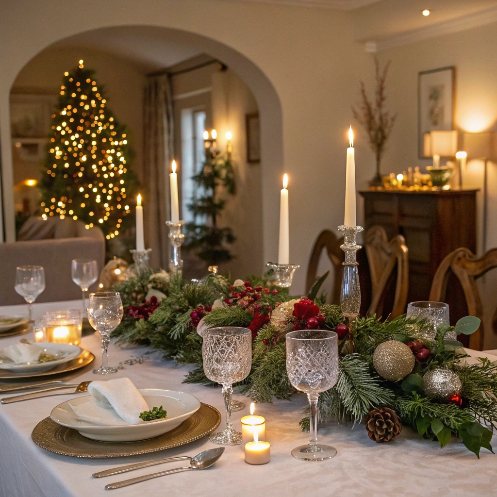 A beautifully decorated festive table setting for a holiday dinner with candles.
