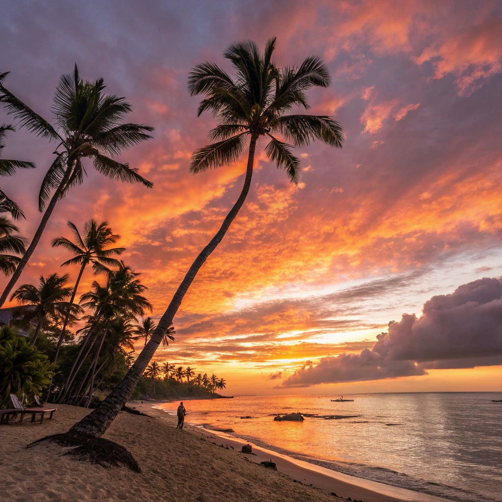 A breathtaking sunset over an exotic beach with palm trees swaying gently.