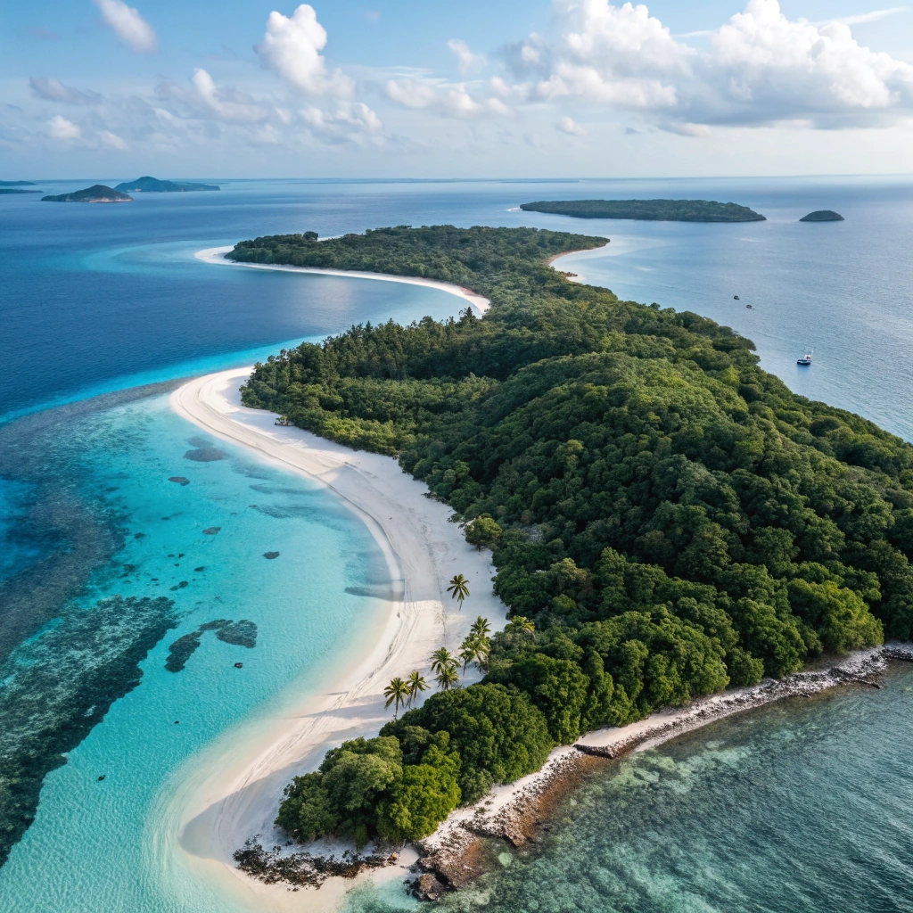 A breathtaking view of a tropical island from above, showcasing white sand beaches and crystal waters.
