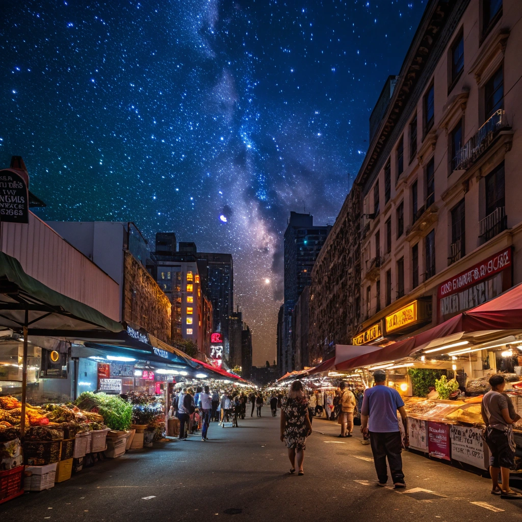 A busy city street with neon lights and a bustling market scene under a starry night sky.