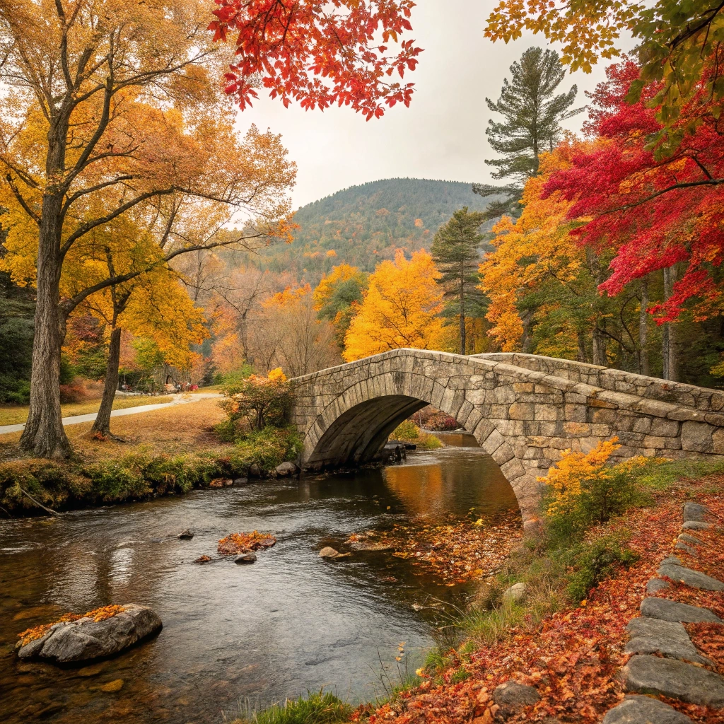 A classic bridge surrounded by autumn foliage, showcasing the beauty of nature transitioning through seasons.