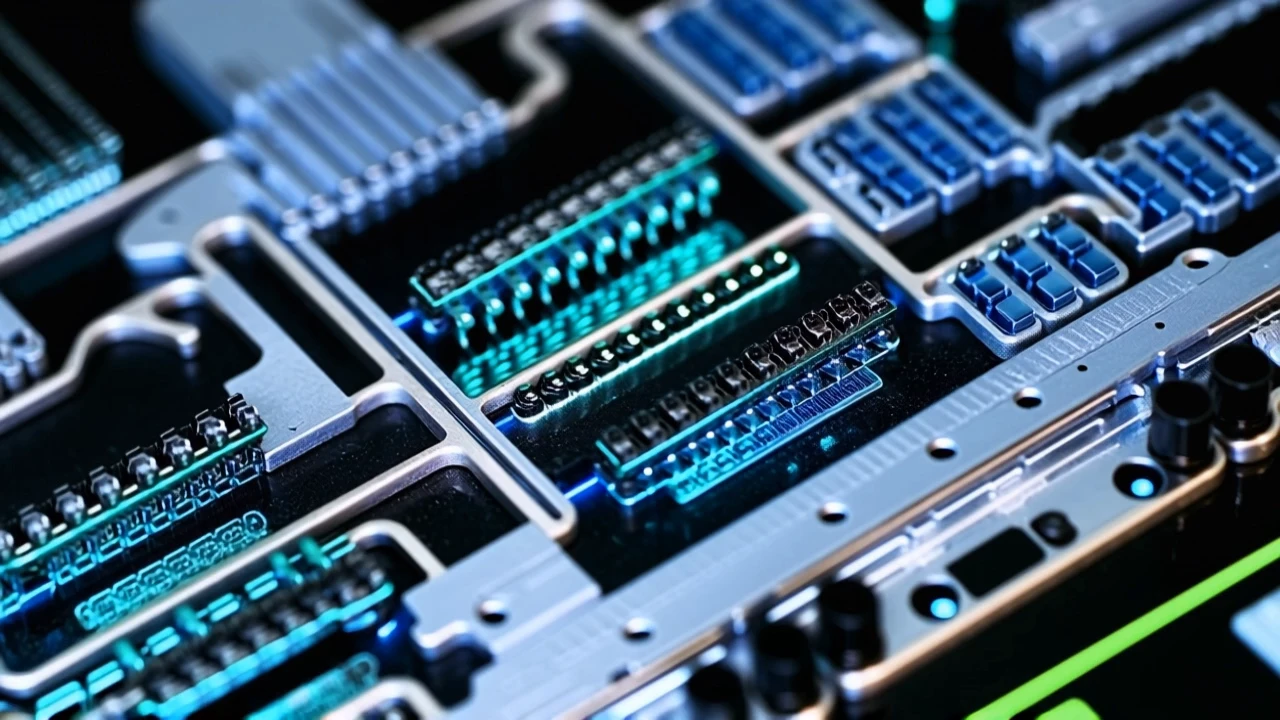 A close-up of a circuit board with glowing components, illustrating advanced technological design.