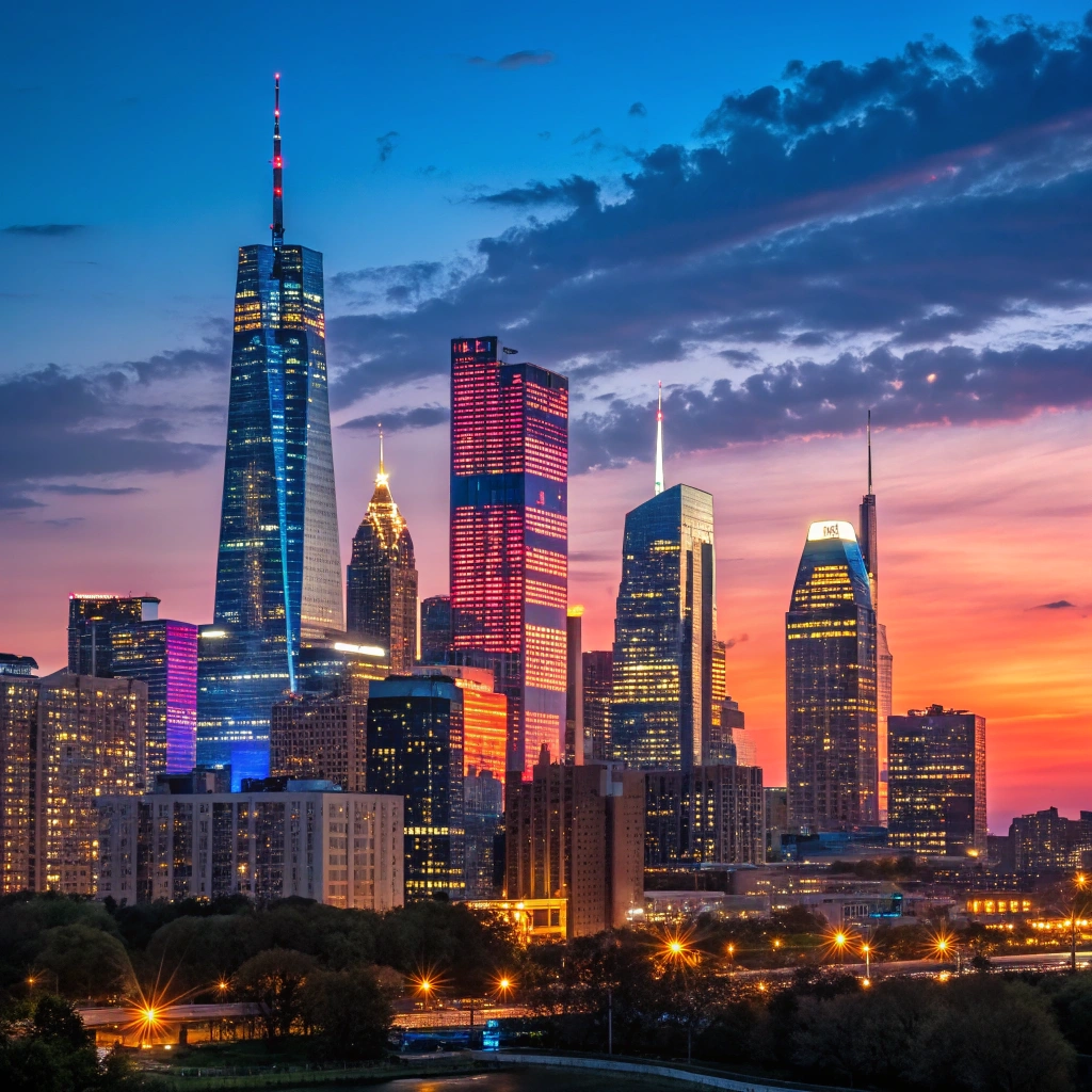 A colorful city skyline with modern buildings illuminated against a twilight sky.