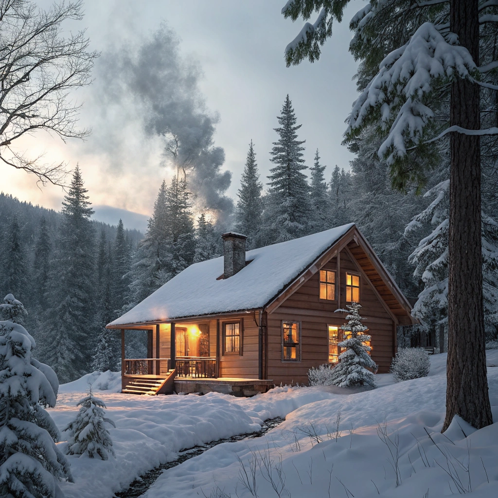 A cozy cabin nestled in the snowy woods, surrounded by evergreen trees.