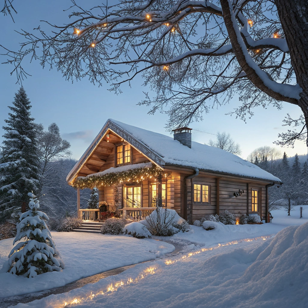 A cozy winter cabin adorned with festive decorations and soft glowing lights, nestled in a snowy landscape