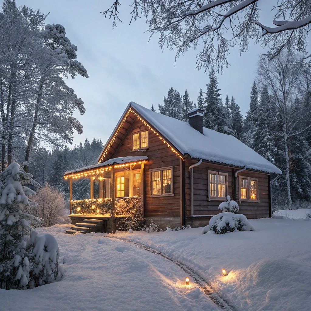 A cozy winter cabin adorned with twinkling lights and a snowy backdrop for the holidays.