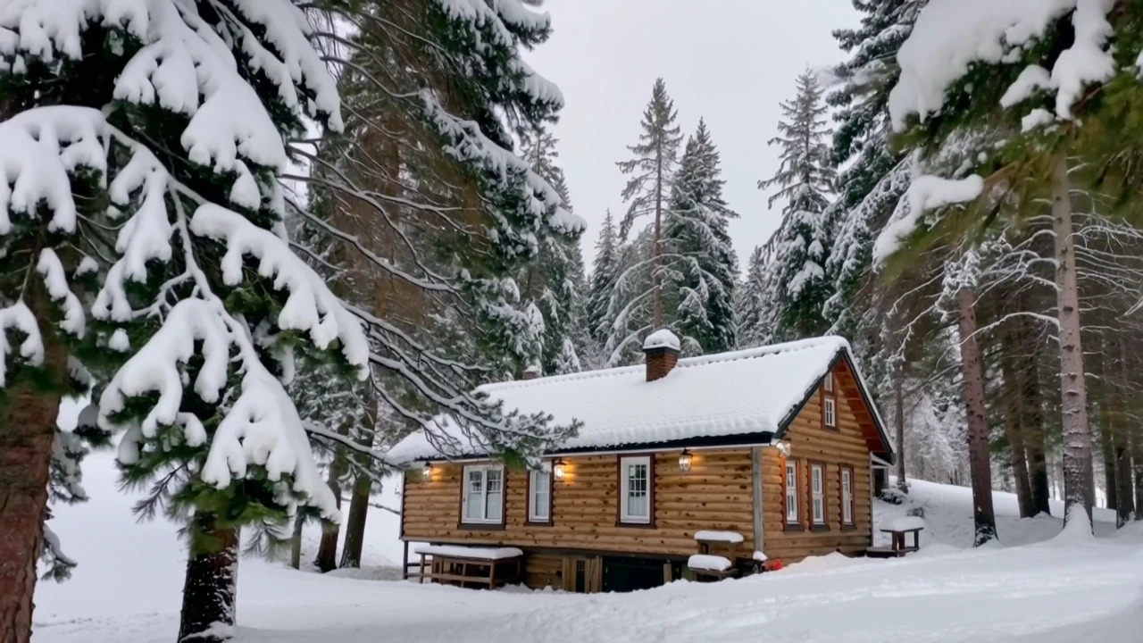 A cozy winter cabin adorned with twinkling lights, surrounded by snow-covered pine trees.