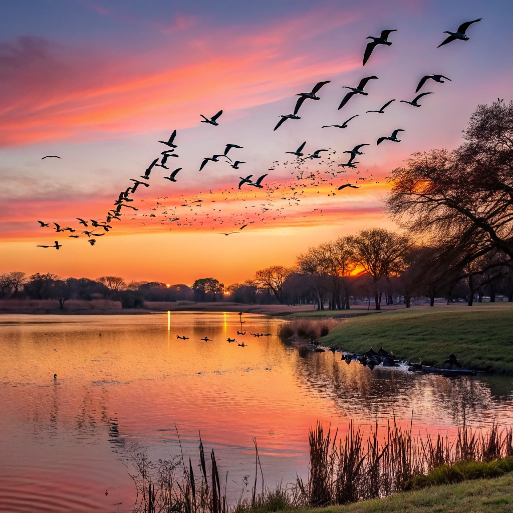 A flock of colorful birds flying over a serene lake at sunset, reflecting the vibrant hues of the sky.