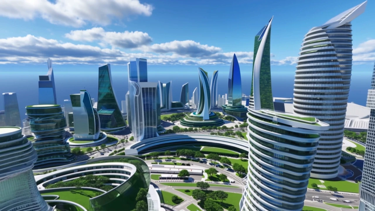 A futuristic city skyline with innovative skyscrapers and green rooftops under a clear blue sky.