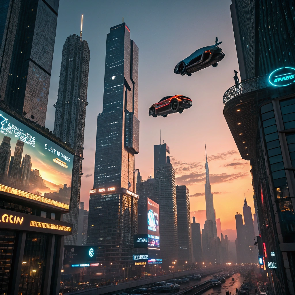 A futuristic cityscape with towering skyscrapers, flying cars, and glowing neon lights at dusk.