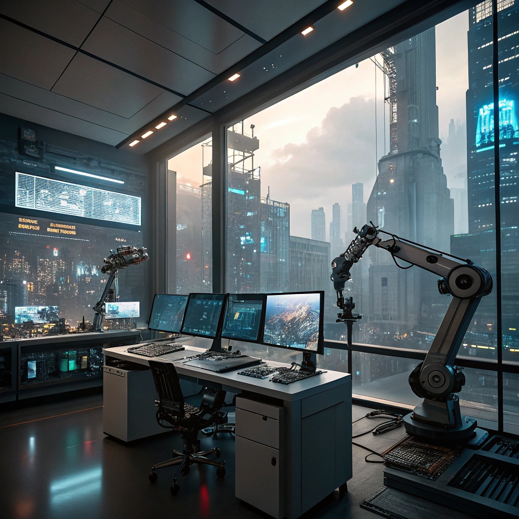 A futuristic workspace filled with cutting-edge gadgets and technology.