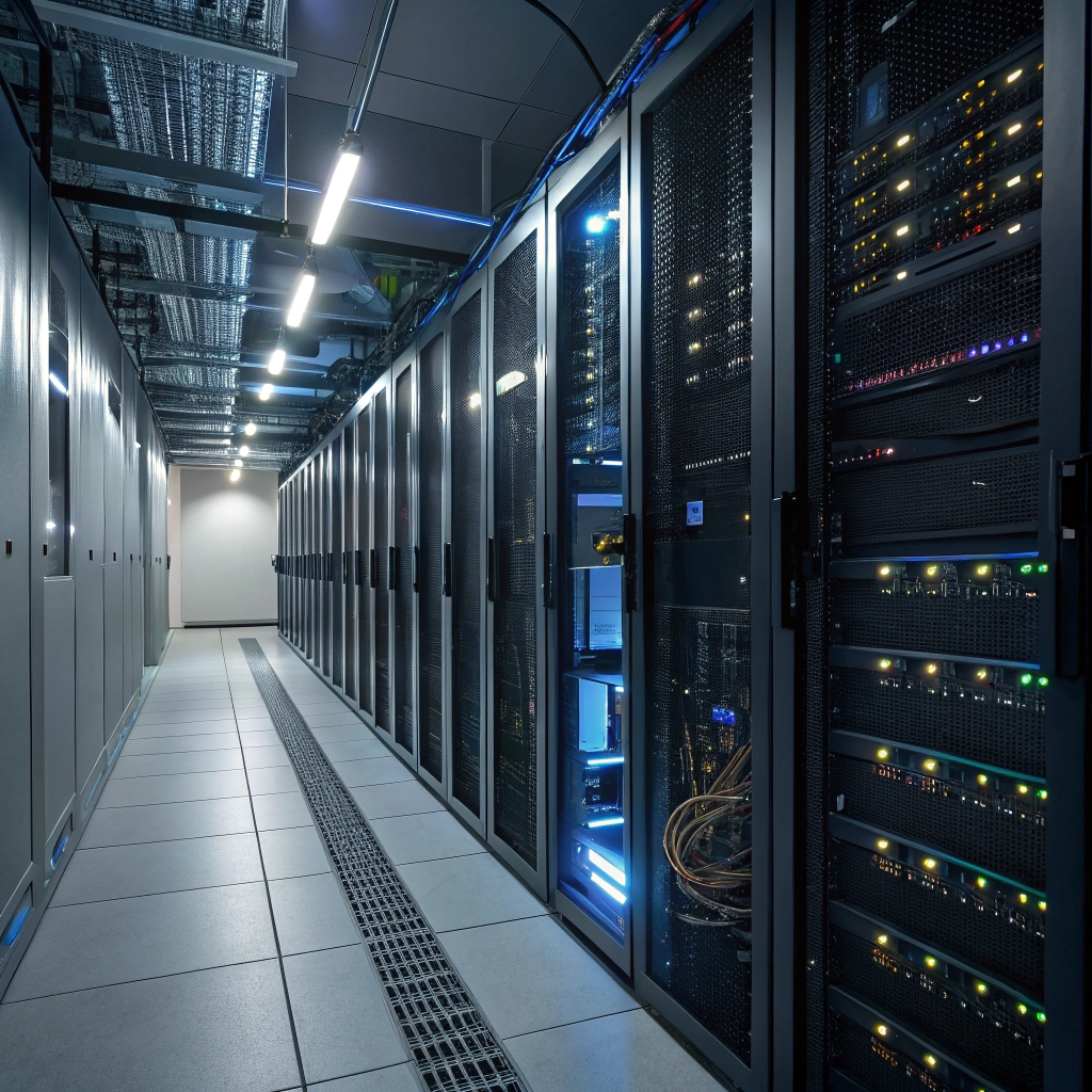 A high-tech server room filled with blinking lights and advanced computer systems.