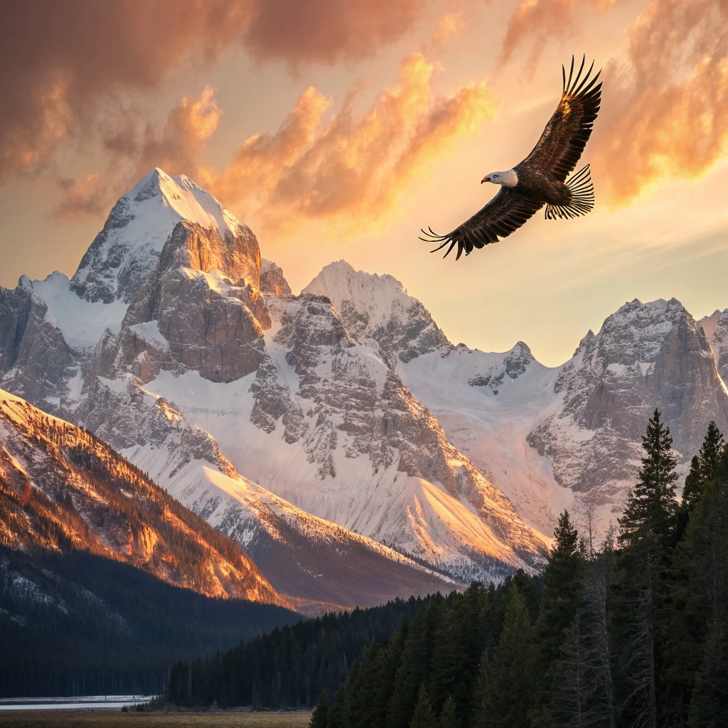 A majestic eagle soaring above a snow-capped mountain range at sunrise.