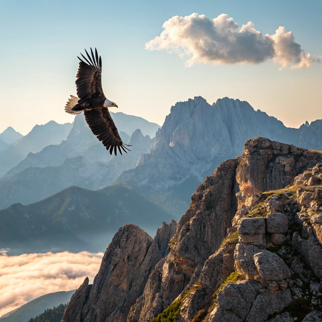 A majestic eagle soaring over a rocky mountain range, capturing the essence of freedom.