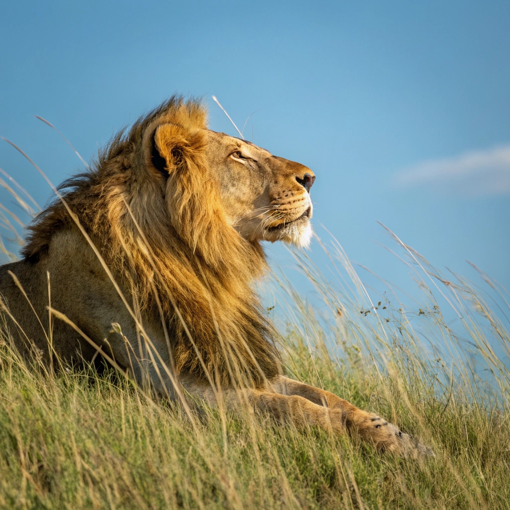 A majestic lion lounging in the tall grass under a bright blue sky.