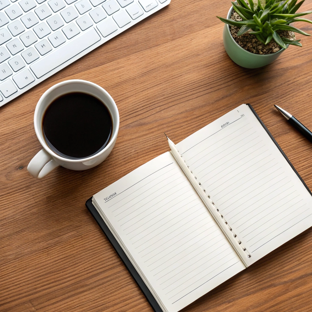 A minimalist workspace with a coffee cup and a notebook on a wooden desk.