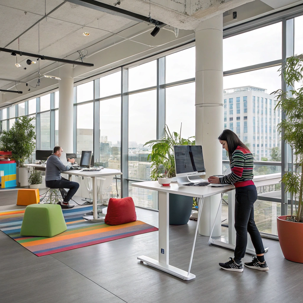 A modern office space with sleek desks and innovative design, showcasing a creative work environment.