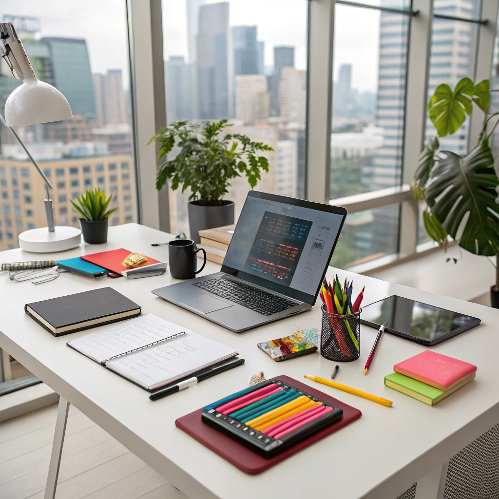 A modern workspace filled with gadgets and office supplies, reflecting a creative and productive environment.