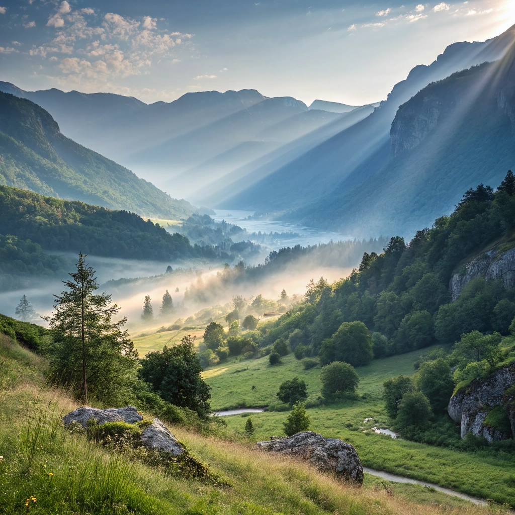 A peaceful mountain valley kissed by the morning mist and rays of sunlight
