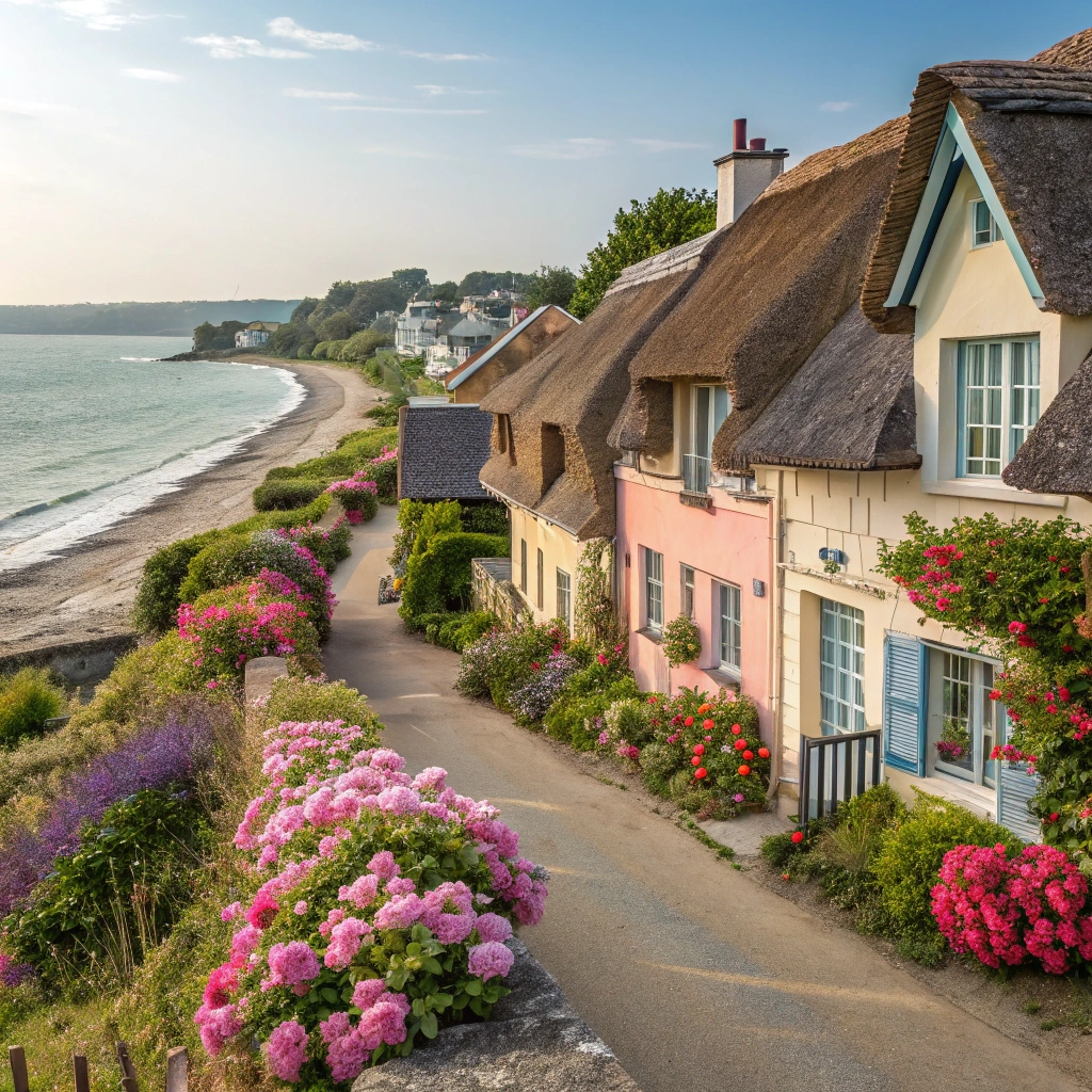 A picturesque seaside village with charming houses and vibrant flowers in bloom.