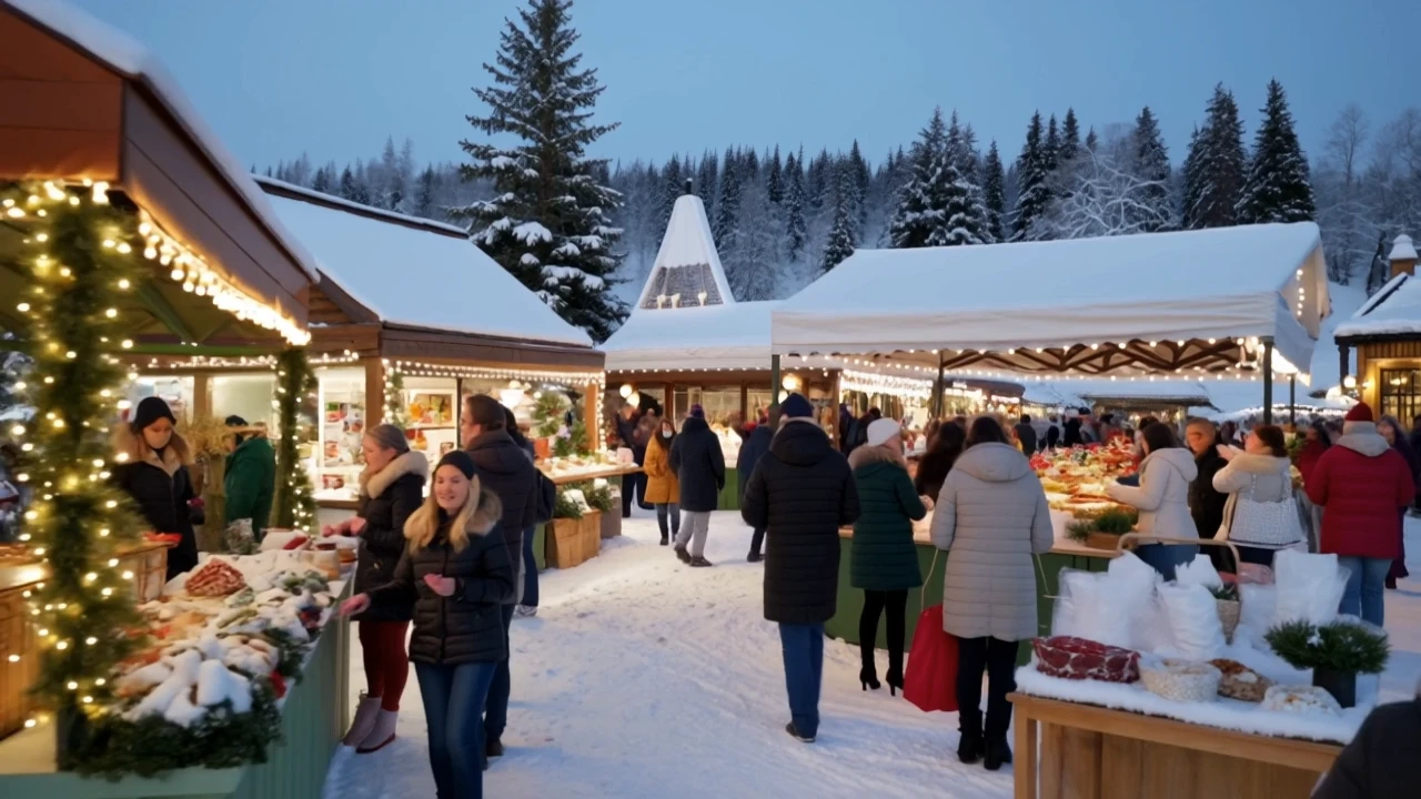 A rustic holiday market with handmade crafts and gourmet food stalls under festive lights.