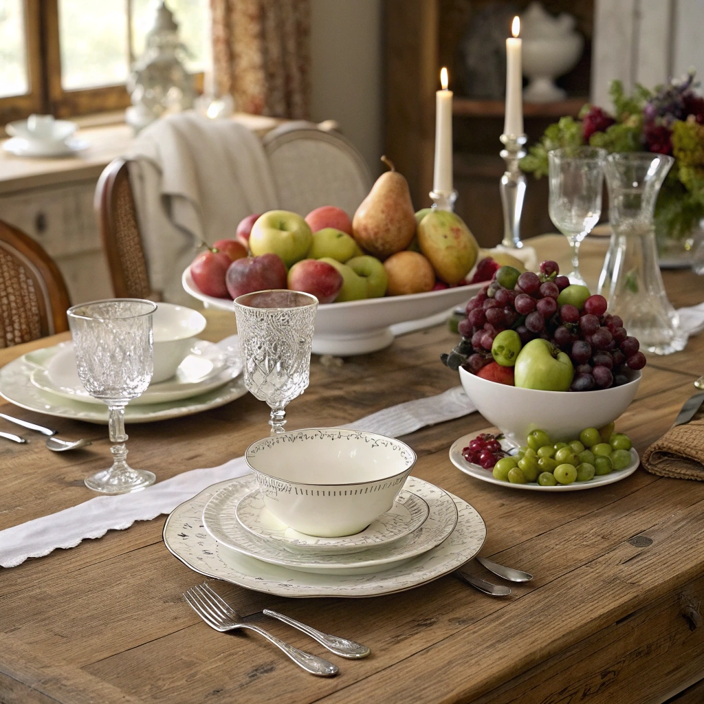 A rustic table set with elegant dinnerware and seasonal fruits.