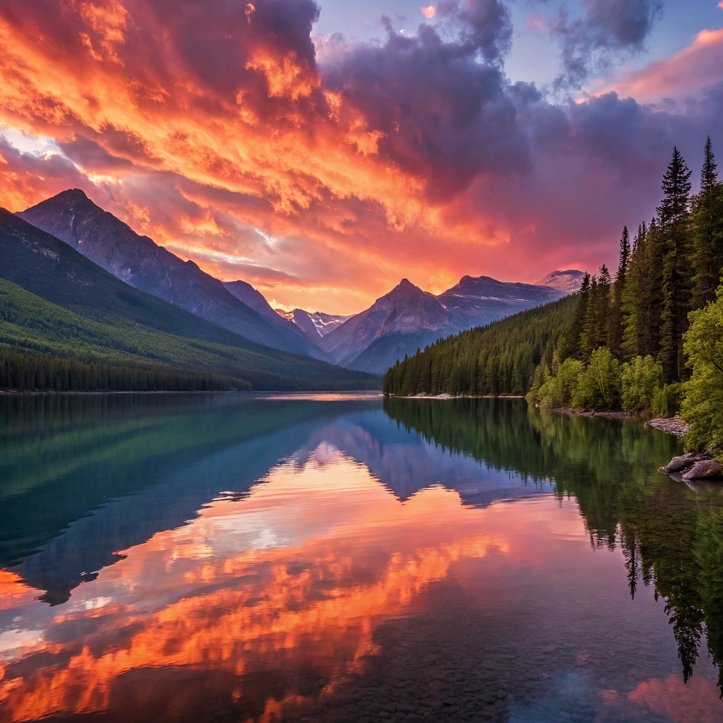 A serene lake surrounded by mountains at sunset, reflecting vibrant colors.