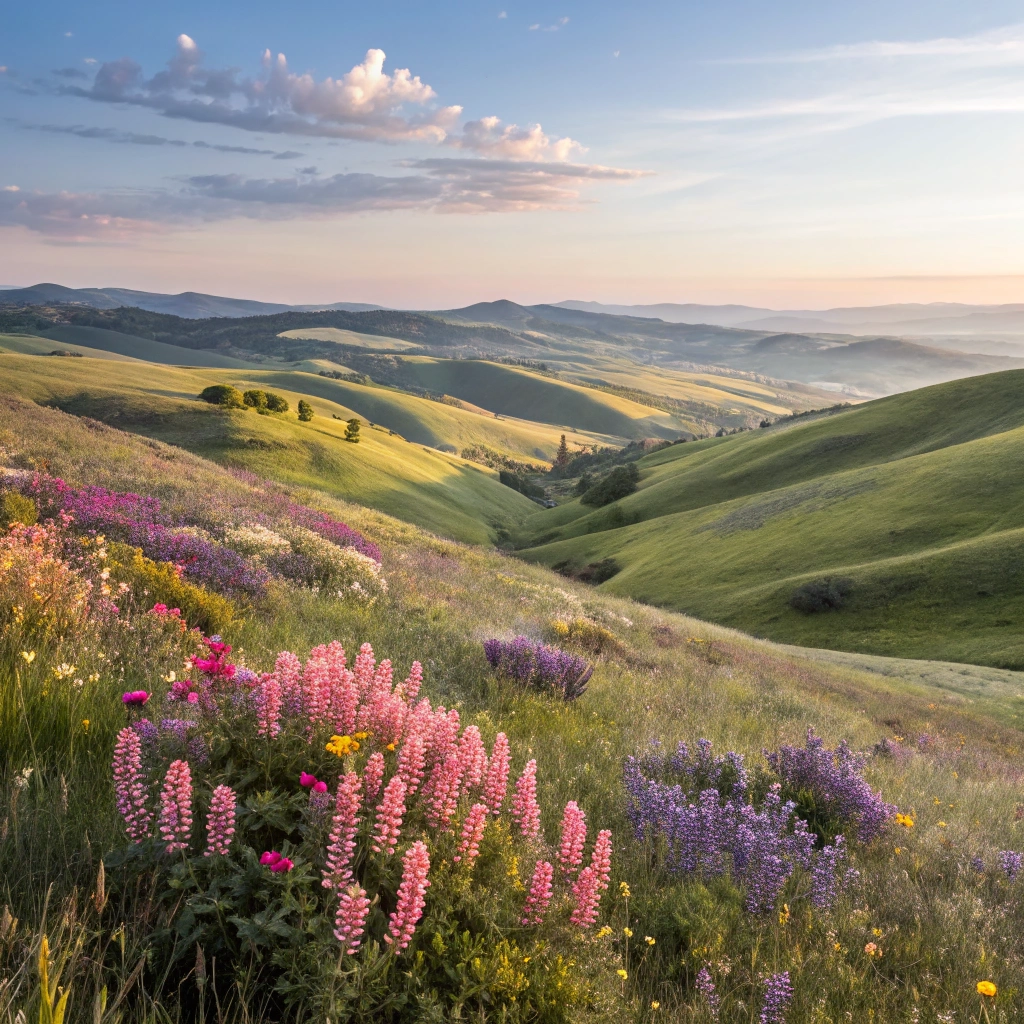 A serene landscape of rolling hills covered in wildflowers, perfect for relaxation.