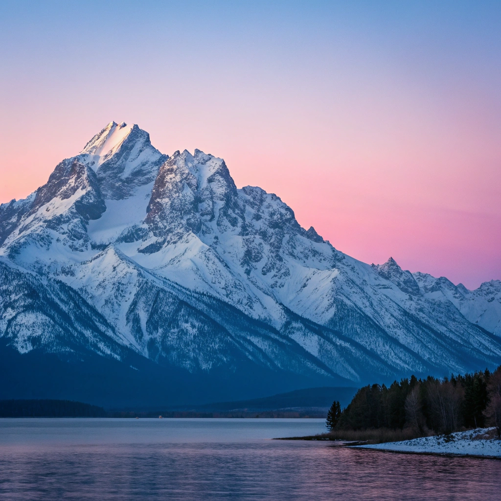 A serene mountain landscape illuminated by the soft glow of dawn.