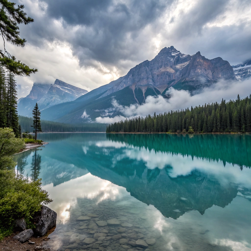 A serene mountain landscape with a crystal-clear lake reflecting the sky