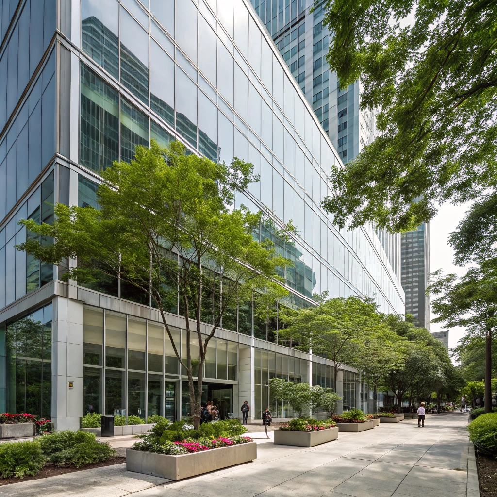 A sleek modern office building with a glass façade, surrounded by urban greenery.
