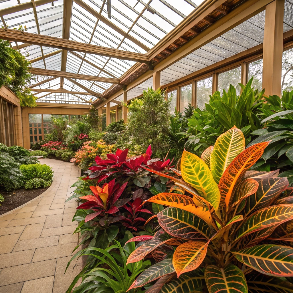 A spacious greenhouse filled with tropical plants in vivid colors and intricate designs.