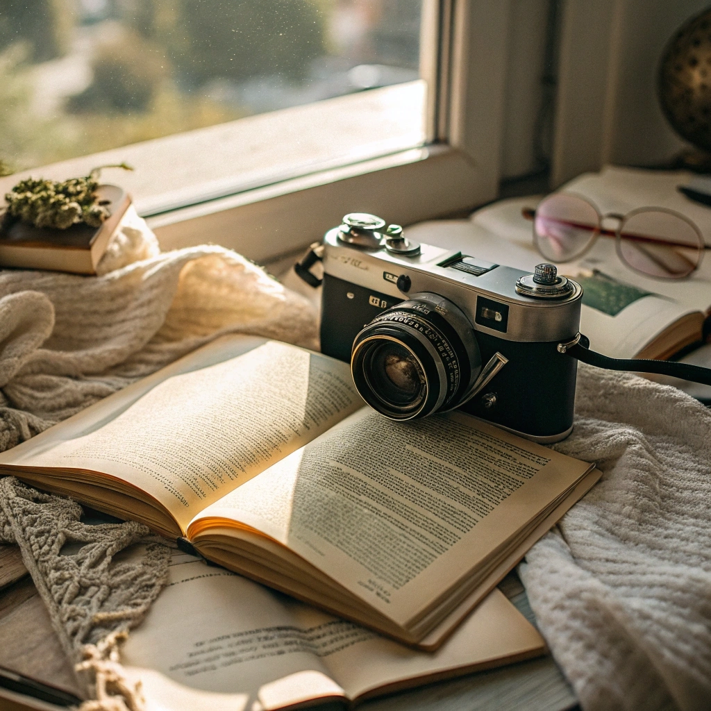 A vintage camera resting on an open book surrounded by soft natural light.