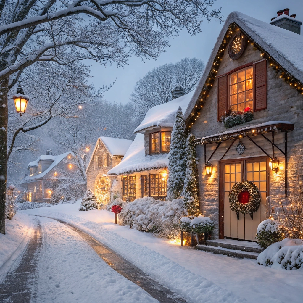 A whimsical winter village, complete with twinkling lights and cozy decorations, blanketed in snow.