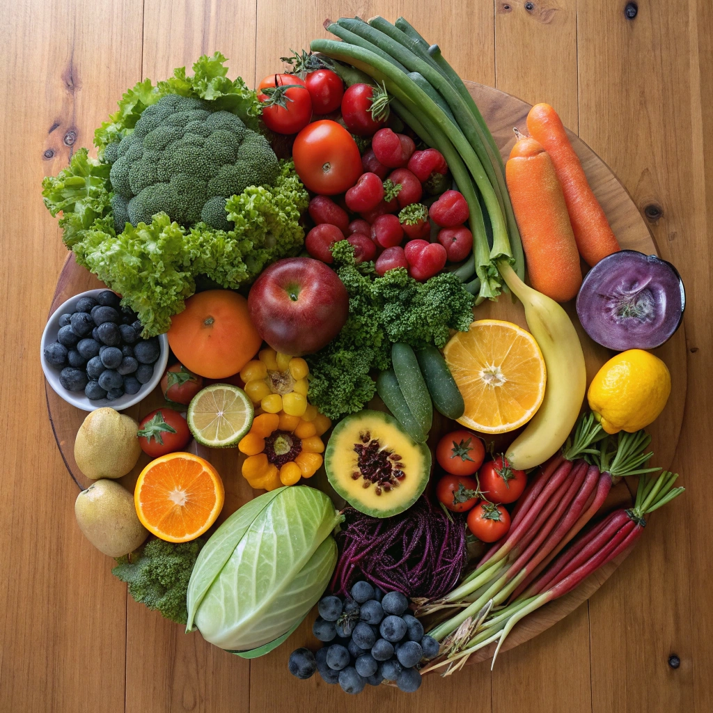 An abstract arrangement of fruits and vegetables on a wooden table, highlighting the colors and textures.