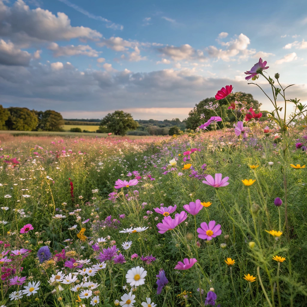 An abundant field of wildflowers swaying gently in the summer breeze.