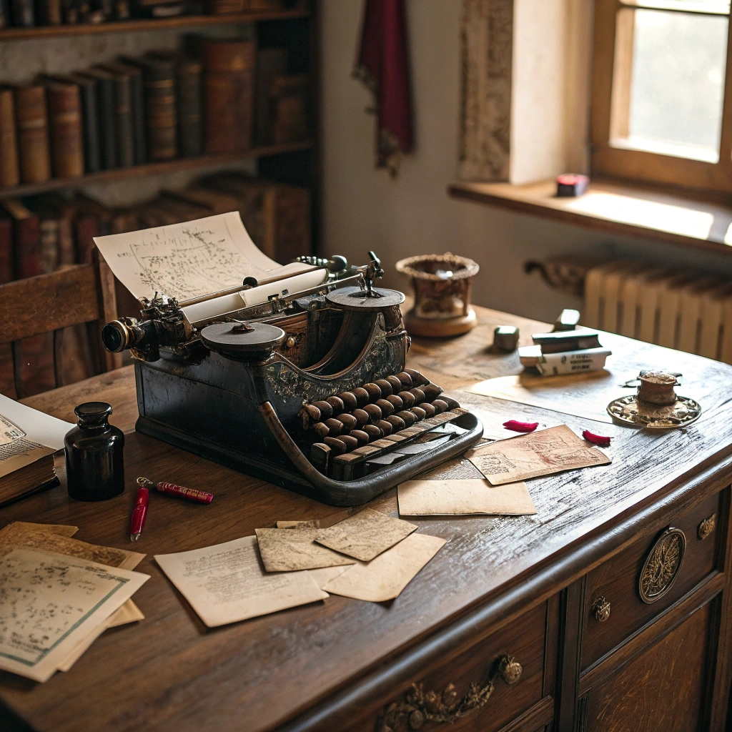 An antique typewriter resting on a vintage desk, with scattered paper and ink pots creating a nostalgic scene.