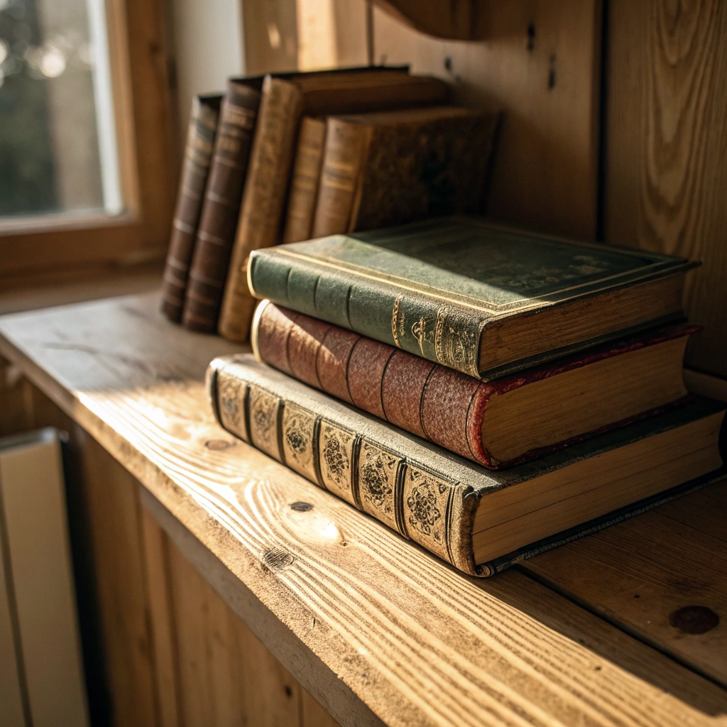 An arrangement of vintage books stacked on a wooden shelf, with soft lighting creating a cozy atmosphere.