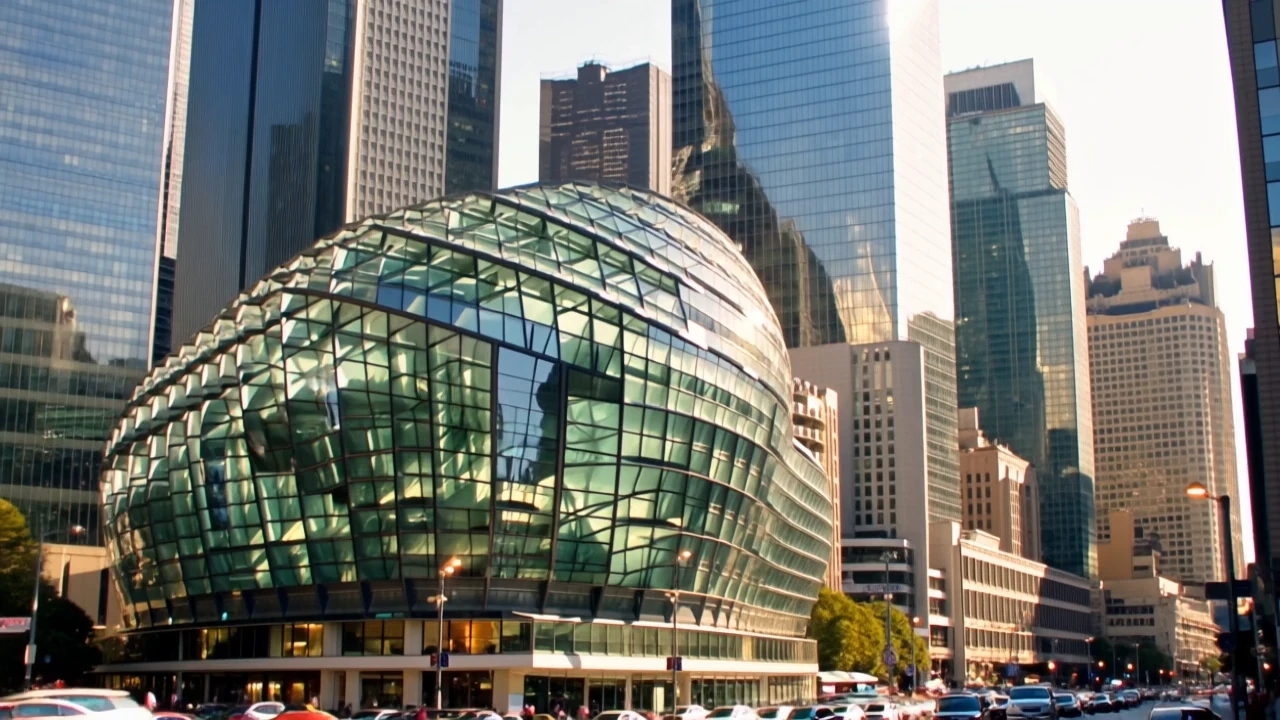 An artistic glass building catching the sunlight in a bustling urban setting.