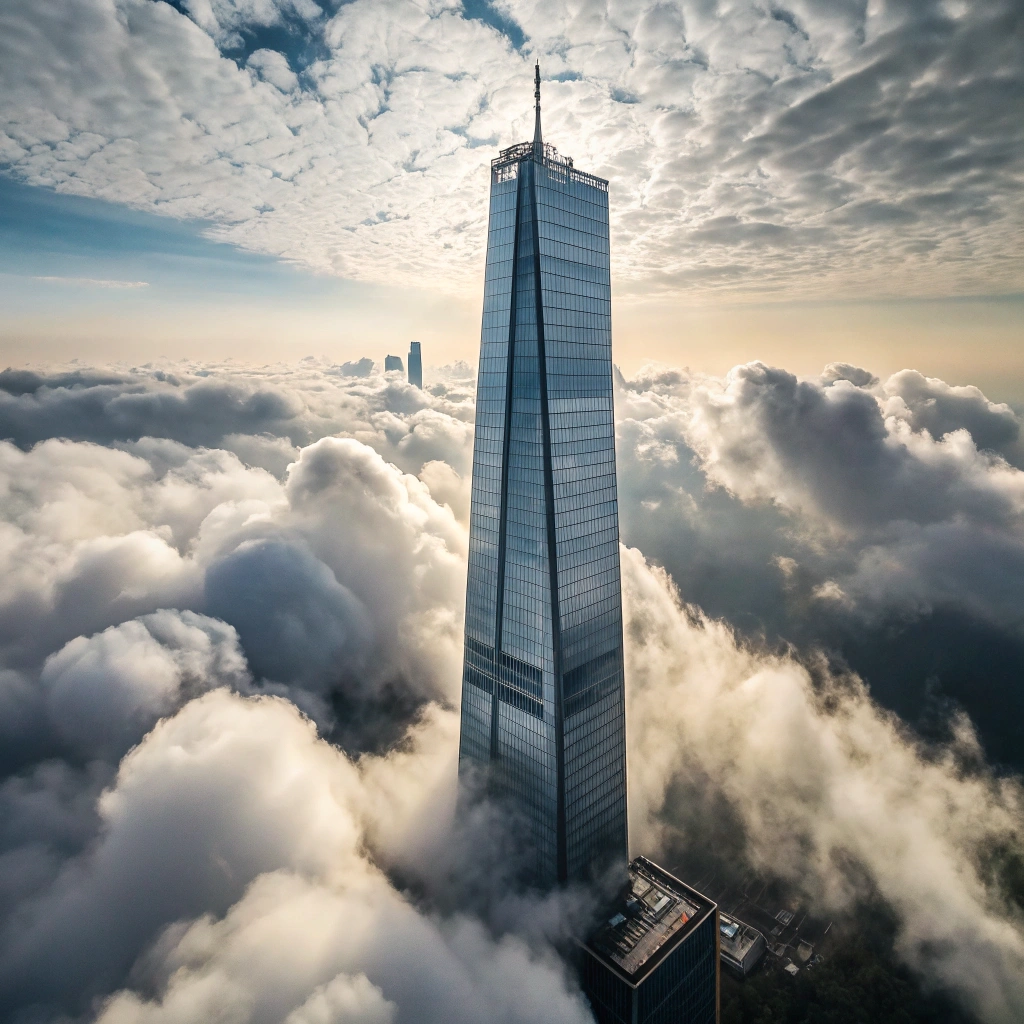 An artistic interpretation of a skyscraper surrounded by clouds.
