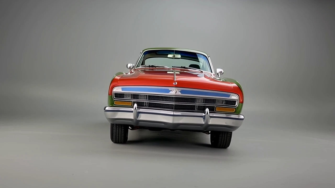 An artistic representation of a classic car in vibrant colors against a minimalist backdrop.