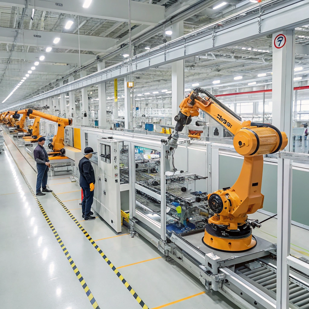 An assembly line in a state-of-the-art factory, with robots working together to enhance production efficiency.